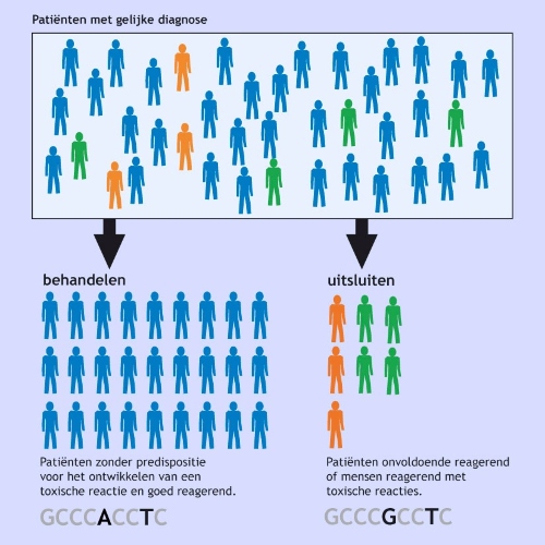 Farmacogenomische kennis toegepast in de medische praktijk. Het is van belang de mensen die reageren op een bepaald geneesmiddel met de gewenste reactie te kunnen onderscheiden van degenen die reageren met een toxische reactie of niet reageren.