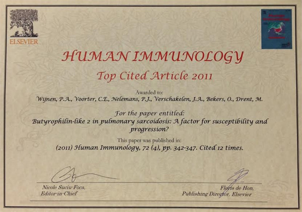Het artikel getiteld: ‘Butyrophilin-like 2 in pulmonary sarcoidosis: a factor for susceptibility and progression?’ (Clin Immunol 2011; 72: 342-347. (PDF)) is in december door Human Immunology uitgeroepen als Top Cited artikel!