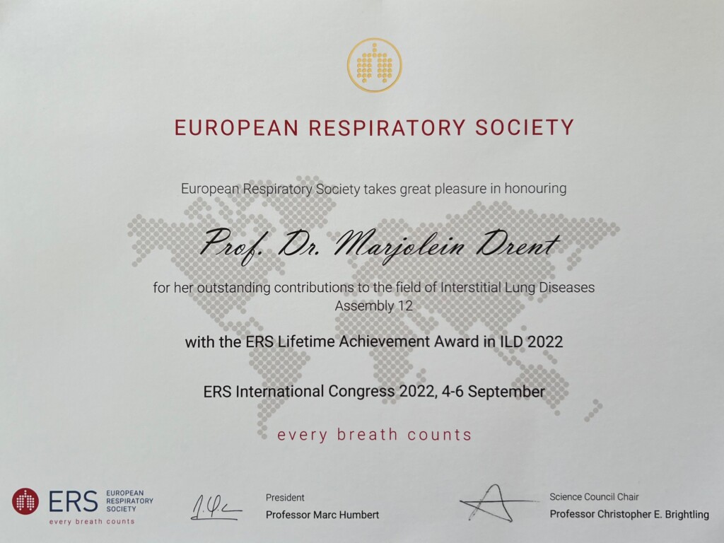 De winnaar dit jaar van de ERS Assembly 12 Lifetime Achievement Award is: Prof. Marjolein Drent als erkenning voor een leven lang uitmuntendheid op het gebied van interstitiële longziekten.