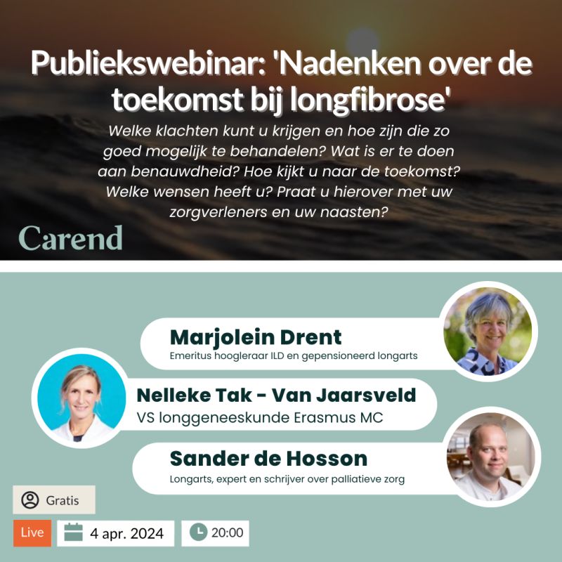 Het Webinar is mogelijk gemaakt door het Nationaal Programma Palliatieve Zorg II en wordt georganiseerd door een samenwerking tussen Carend, de Longfibrose patiëntenvereniging, Palliatieve Zorg Nederland (beheerder van Overpalliatievezorg.nl), de Patiëntenfederatie Nederland, en de ild care foundation. Het Webinar is online en gratis toegankelijk na aanmelding. Het is ook nog terug te kijken.