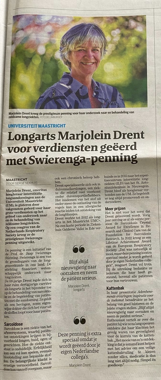Marjolein Drent is tevens emeritus-hoogleraar interstitiële longaandoeningen aan de Universiteit Maastricht, gast-senior researcher van het ILD Expertisecentrum, afdeling longziekten van het St. Antonius Ziekenhuis Nieuwegein en lid van de Witte Raven.
