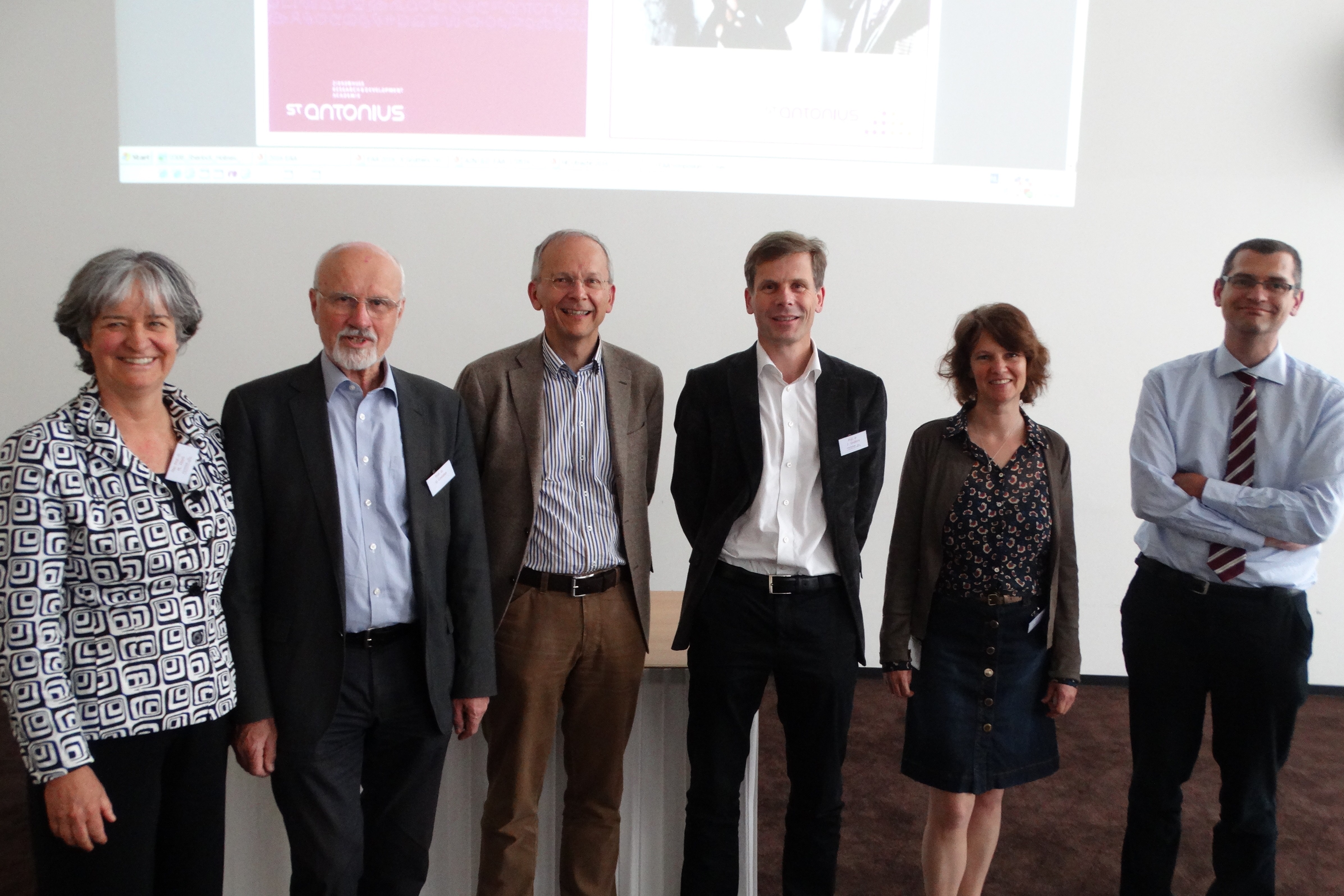 Foto 4. Sprekers en leden organisatie symposium van links naar rechts: prof. Marjolein Drent (longarts ILD Expertisecentrum), prof. Ulrich Costabel (longarts Essen, Duitsland), dr. Jos Rooijackers (longarts NKAL: Nederlandse Kenniscentrum Arbeid en Longaandoeningen, Utrecht), prof. Jan Grutters (longarts en hoofd ILD Expertisecentrum), dr. Coline van Moorsel (hoofd research team ILD Expertisecentrum) en prof. Wim Wuyts (longarts Leuven, België).